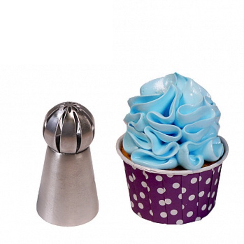 Насадка Восточная роза для создания высоких пушистых шапочек для капкейков. Крем ложится мягкими волнами, создавая удивительные складки. Эта насадка имеет средние прорези с цветком посередине. Благодаря этому рисунок получается объемный и очень красивый.